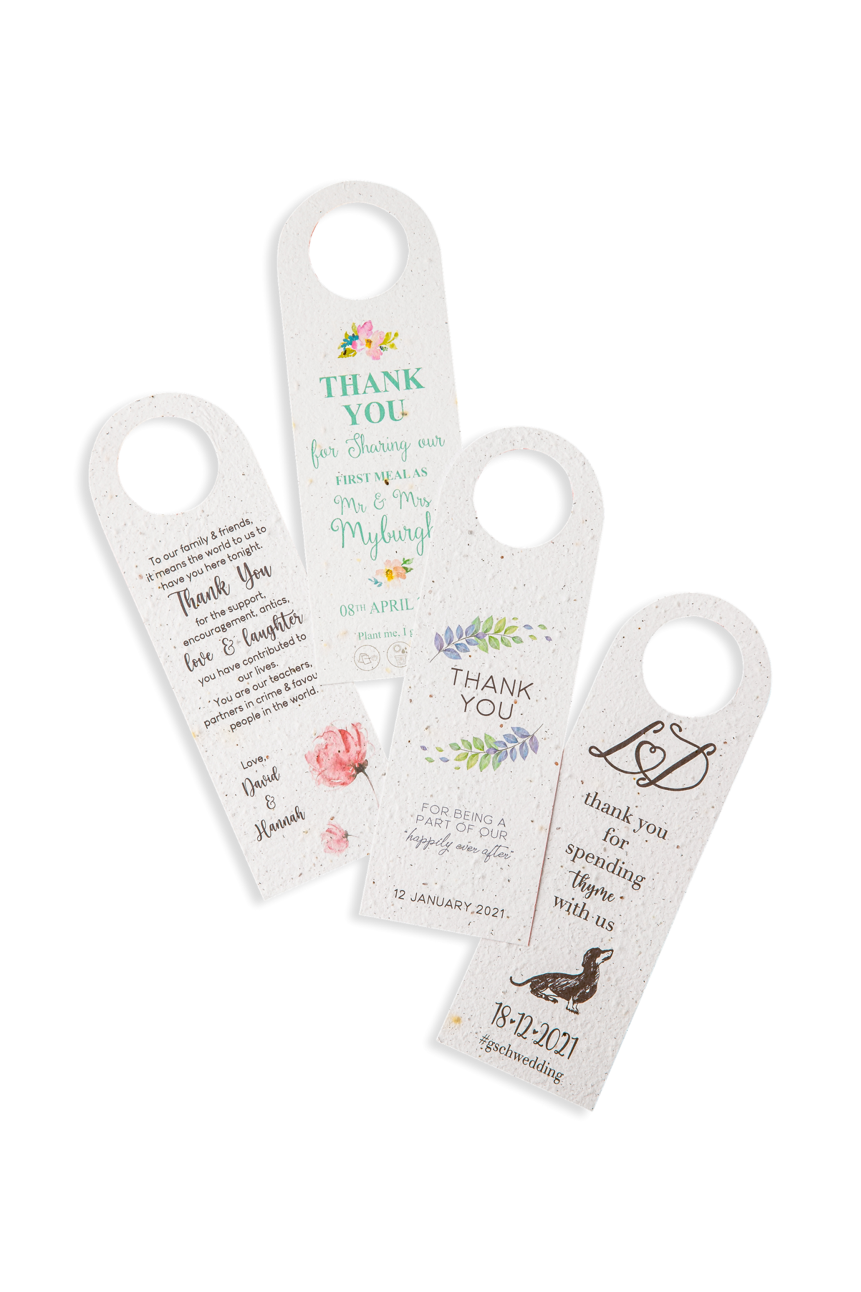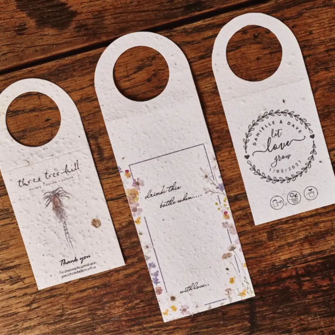 Made from 100% recycled paper and embedded with seeds, our customizable neck tags turn wine gifts into blooming keepsakes.